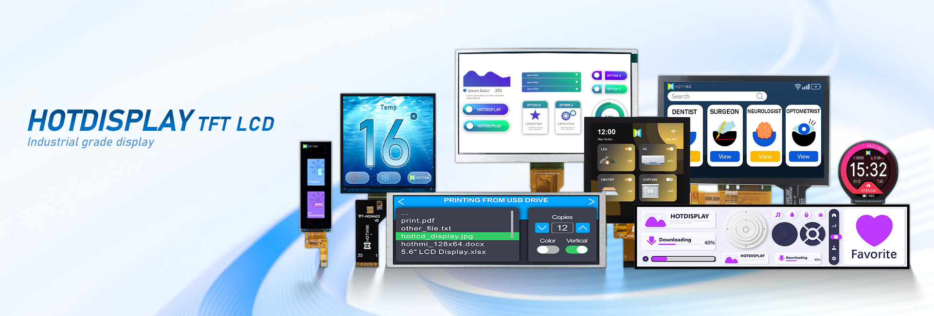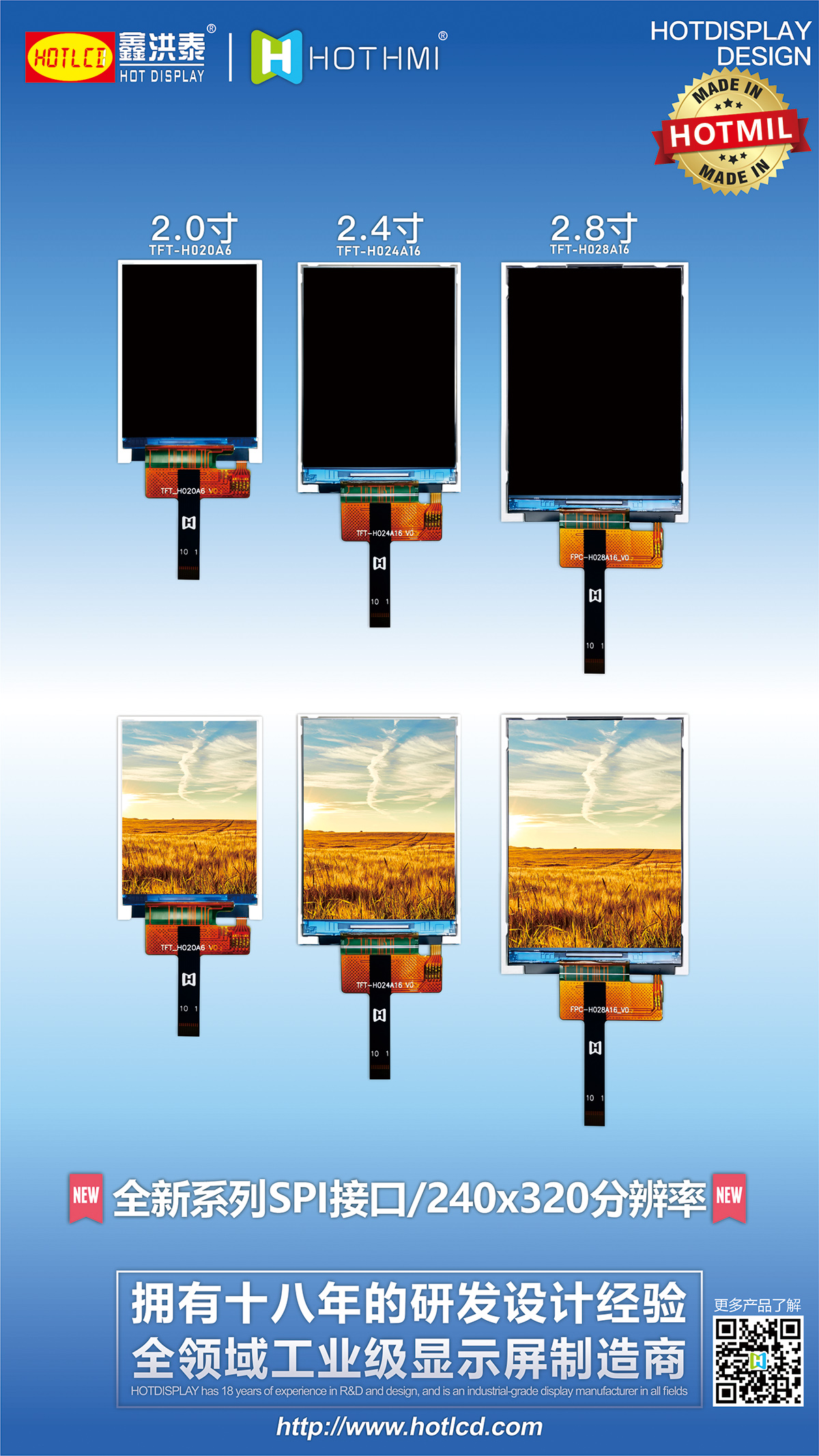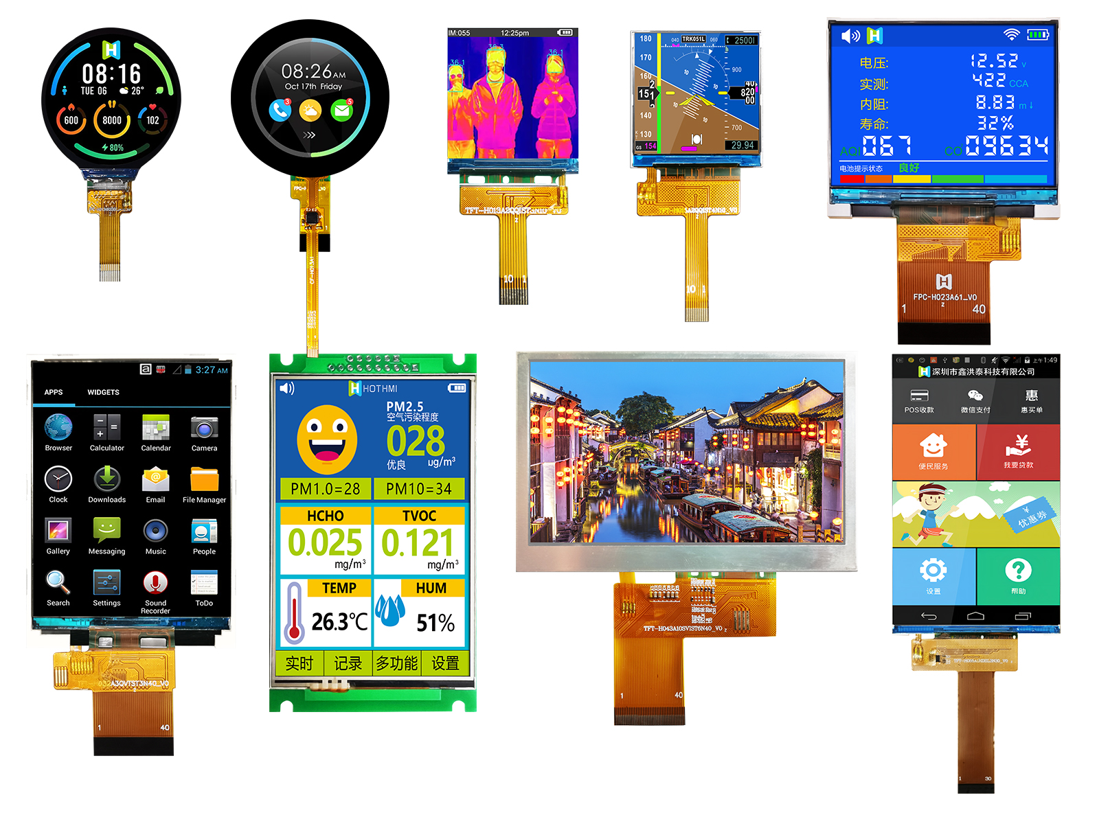 HOTLCD創立22年來,已開發出超過2000款標準和非標準液晶顯示屏及模組,廣泛應用于人工智能、5G通訊、無人機、物聯網、車聯網、智能家居、智能穿戴、智慧交通、儀器儀表、醫療設備、工控設備、電力設備、勘探設備、航空航天、軍事裝備等諸多先進領域。